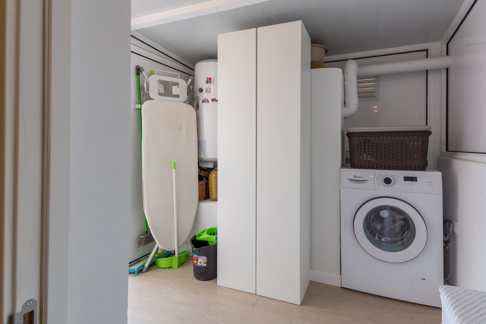 En el mismo nivel de la casa otra terraza que se comunica por la misma terraza delantera o por el lavadero, en ella se ha hecho una tercera habitación cerrada con cortinas de cristal que actualmente se utiliza como despacho, para aquellos que tele trabajan o quieren tener una habitación de invitados independiente puede ser una excelente solución, la superficie aproximada es de unos 100m2 y cubierta de unos 35m2.