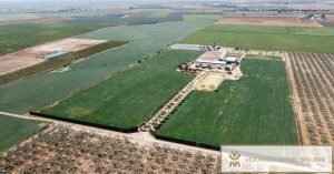 La balsa de agua, con 2,540 m² de lámina de agua y una capacidad de 60,000 m³, se abastece de las canalizaciones de riego del Bajo Guadalquivir, garantizando un suministro constante y confiable para la finca.