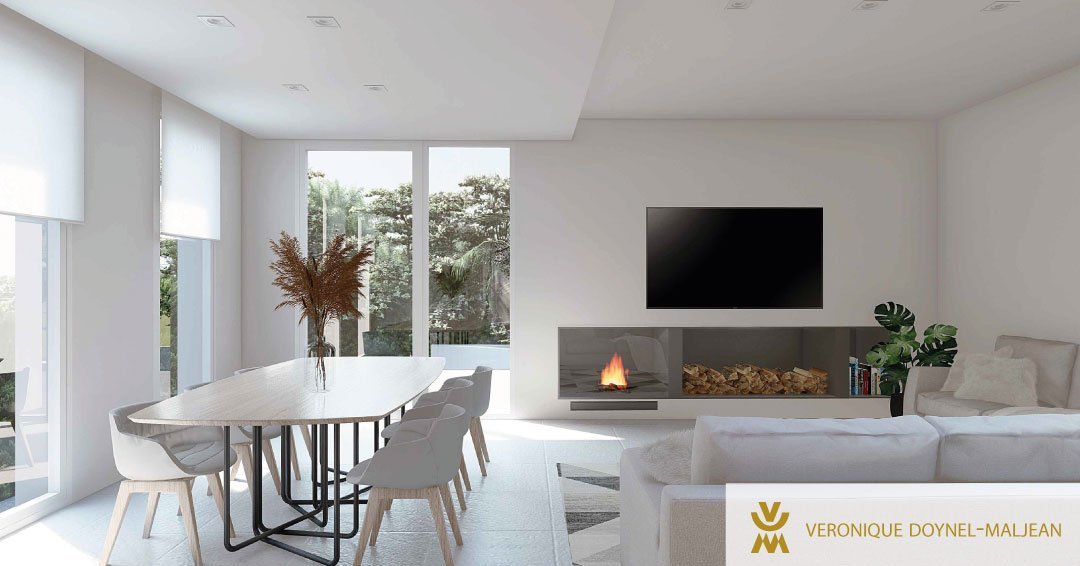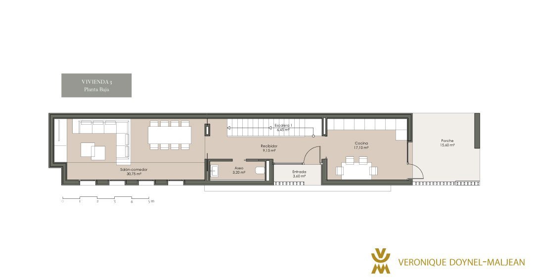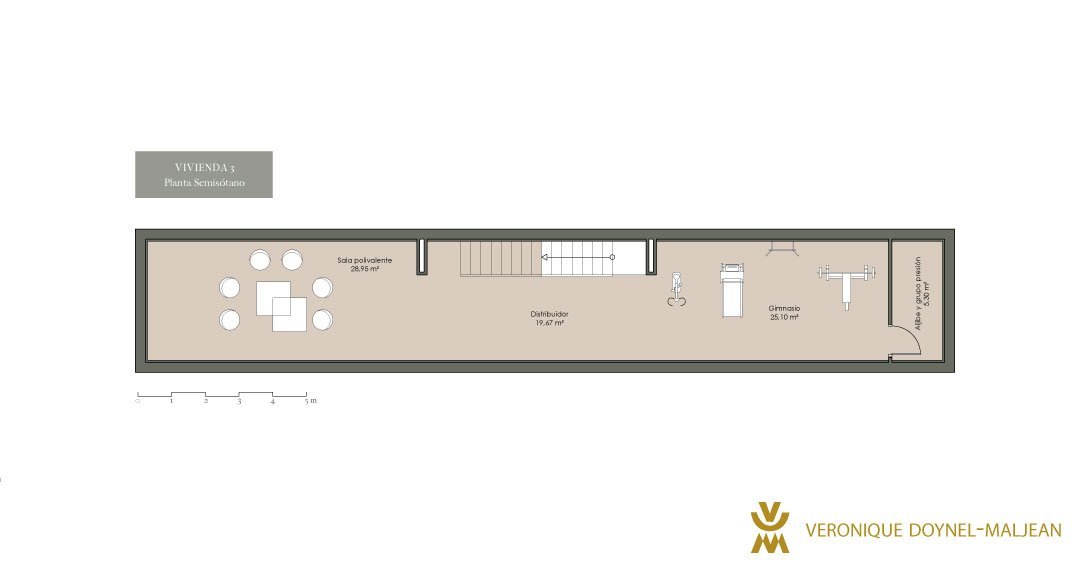 Esta vivienda cuenta con 3 plantas: semisótano, baja y primera planta. En la planta baja, encontramos el salón y comedor que se unen en un único espacio, integrando la escalera abierta que cuenta con un lucernario, permitiendo así la entrada de luz indirecta. Además, esta planta cuenta con amplios ventanales que permiten tener una relación directa con el exterior y los fantásticos espacios de terraza y jardín.